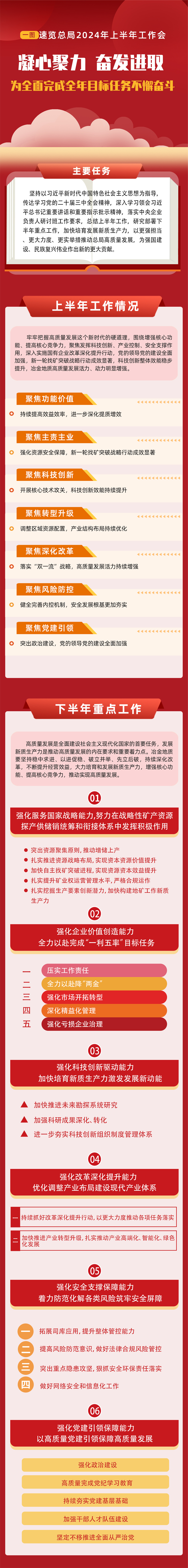 王文军在题为《凝心聚力 奋发进取 为全面完成全年目标任务不懈奋斗》的讲话中,对总局上半年工作进行了总结,对下半年工作进行了部署。他强调,今年以来,总局深入实施国有企业改革深化提升行动,党的领导党的建设全面加强,新一轮找矿突破战略行动成效显著,科技创新整体效能稳步提升,冶金地质高质量发展活力、动力明显增强。上半年总局聚焦功能价值,持续提高效益效率,提质增效进一步深化;聚焦主责主业,强化资源安全保障,新一轮找矿突破战略行动成效显著;聚焦科技创新,开展核心技术攻关,科技创新效能持续提升;聚焦转型升级,调整区域资源配置,产业结构布局持续优化;聚焦深化改革,落实“双一流”战略,高质量发展活力持续增强;聚焦风险防控,健全完善内控机制,安全发展根基更加夯实;聚焦党建引领,突出政治建设,党的领导党的建设全面加强。下半年总局将聚焦高质量发展这个首要任务,围绕发展新质生产力这个内在要求和重要着力点,坚持稳中求进、以进促稳、破立并举、先立后破,持续深化改革,不断提升经营效益,大力培育和发展新质生产力,增强核心功能、提高核心竞争力。一要强化服务国家战略能力,推动增储上产、推进资源战略布局、加快自主找矿突破进程、提升矿业权运营管理水平、挖掘生产要素创新潜力,加快构建地矿工作新质生产力,努力在战略性矿产资源探产供储销统筹和衔接体系中发挥积极作用。二要强化企业价值创造能力,进一步压实工作责任,强化市场开拓转型,深化精益化管理,强化亏损企业治理,全力以赴降“两金”。三要强化科技创新驱动能力,加快推进未来勘探系统研究、加强科研成果深化转化、进一步夯实科技创新组织制度管理体系,加快培育新质生产力激发发展新动能。四要强化改革深化提升能力,持续抓好改革深化提升行动、加快推进产业转型升级,推动产业布局优化调整建设现代产业体系。五要强化安全支撑保障能力,拓展司库应用,提升整体管控能力;提高风险防范意识、做好法律合规风险管控;突出重点隐患攻坚,狠抓安全环保责任落实;做好网络安全和信息化工作,着力防范化解各类风险筑牢安全屏障。六要强化党建引领保障能力,强化政治建设,高质量完成党纪学习教育,持续夯实党建基层基础,加强干部人才队伍建设,坚定不移推进全面从严治党,以高质量党建引领保障高质量发展。