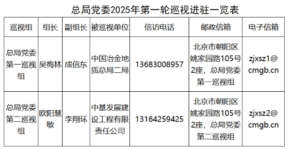 根据总局党委巡视工作统一部署,截至2月27日,总局党委2025年第一轮巡视中国冶金地质总局二局党委、中基发展建设工程有限责任公司党委的两个巡视组分别完成进驻。