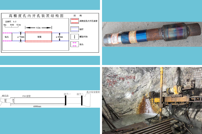 该装置主要应用在矿山井下超前探放水钻孔工程实施中。以往大口径孔口管内直接施工小口径钻孔,开孔偏差(方位)较大,为保证开孔精度及成功率,设计此管内开孔装置,保证钻具和孔口管的紧密贴合,实现高精度管内开孔。此装置安装简单,易操作,成本较低,能保证探放水施工管内开孔精度,提高开孔成功率,确切查明水情,消除水患,在山东黄金集团有限公司下属玲珑金矿、焦家金矿等矿山进行推广应用,在玲珑金矿探放水工程、井下超前探空探水及水患防治、焦家金矿焦家分矿井下坑内探放水钻孔施工应用效果较好。