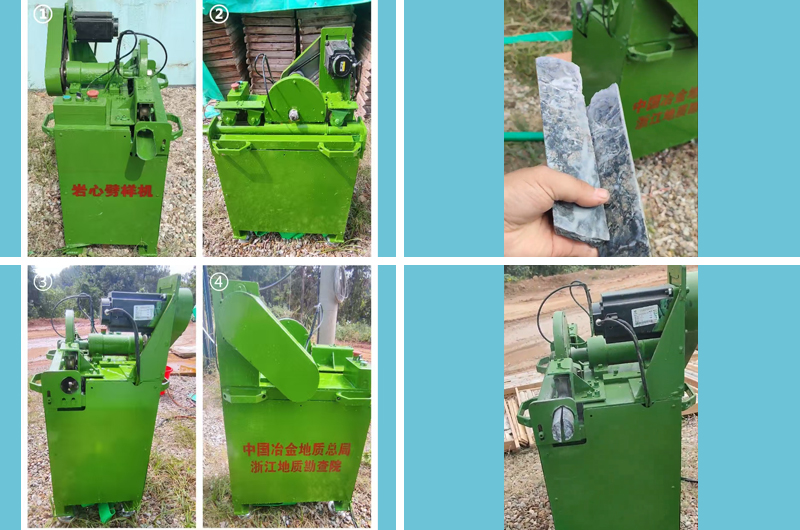 一种岩芯劈样装置为钻探岩芯采样机器,该机器有安全、环保、效率高的特点,切割刀片安装有保护罩,保护罩内有自动喷水装置,操作简单、安全,切割样品均匀;长度大于15厘米的岩心,每小时可切割8米。