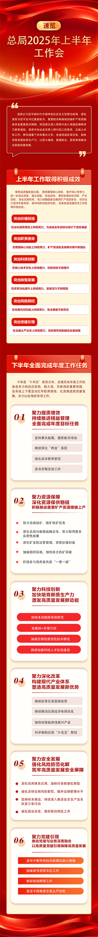 王文军在报告中指出,上半年总局在深化提质增效、增强核心功能、核心技术攻关、改革深化提升、完善内控机制、全面从严治党等方面持续用力,改革发展和党的建设各项工作取得积极成效。下半年,全系统上下要聚力提质增效、资源保障、科技创新、深化改革、安全发展和党建引领等方面,持续推进精益管理、深化资源保供稳链、加快培育壮大新质生产力、构建现代产业体系、强化风险防范化解、推动党建与业务深度融合,实现重要矿产资源增储上产,不断激发高质量发展新动能、塑造新优势,筑牢安全屏障,以高质量党建引领保障高质量发展。